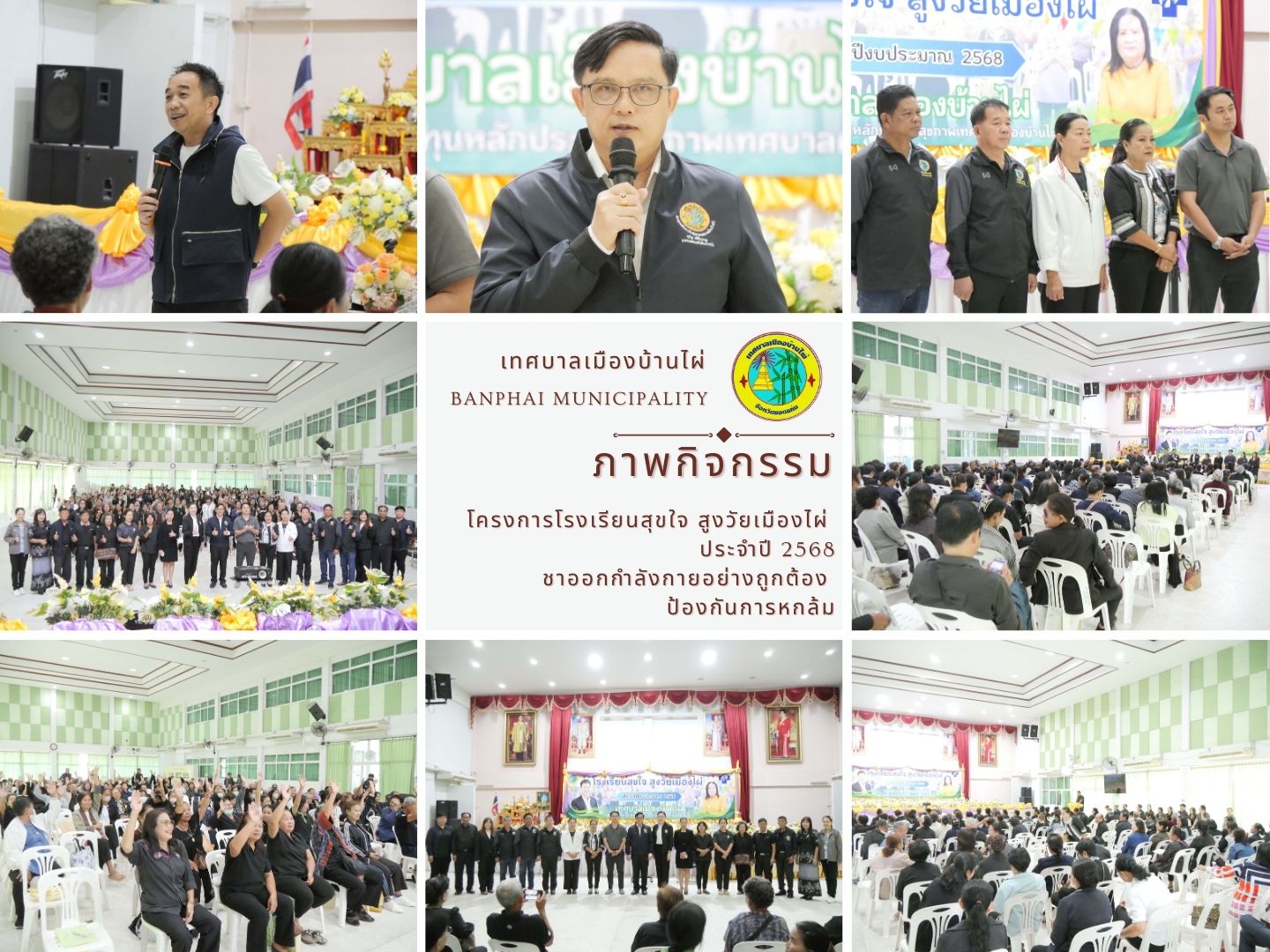 วันที่ 4 ธันวาคม 2568 นายศรัญ กสิกิจวรกุล นายกเทศมนตรีเมืองบ้านไผ่ มอบหมายให้จ่าเอก ดร.กิตติพล บัวทะลา ปลัดเทศบาล เป็นประธานเปิดโครงการโรงเรียนสุขใจ สูงวัยเมืองไผ่ ประจำปี 2568 วิชาออกกำลังกายอย่างถูกต้อง ป้องกันการหกล้ม เพื่อส่งเสริมให้ผู้สูงอายุได้รับความรู้ในการดูแลสุขภาพกายและสุขภาพจิตของตนเองอย่าง ต่อเนื่องและเหมาะสม เป็นการสร้างคุณค่าในตนเองของผู้สูงอายุ อีกทั้งยังเป็นการชะลอไม่ให้ผู้สูงอายุกลายเป็นผู้สูงอายุติดบ้าน และเป็นผู้ป่วยติดเตียง