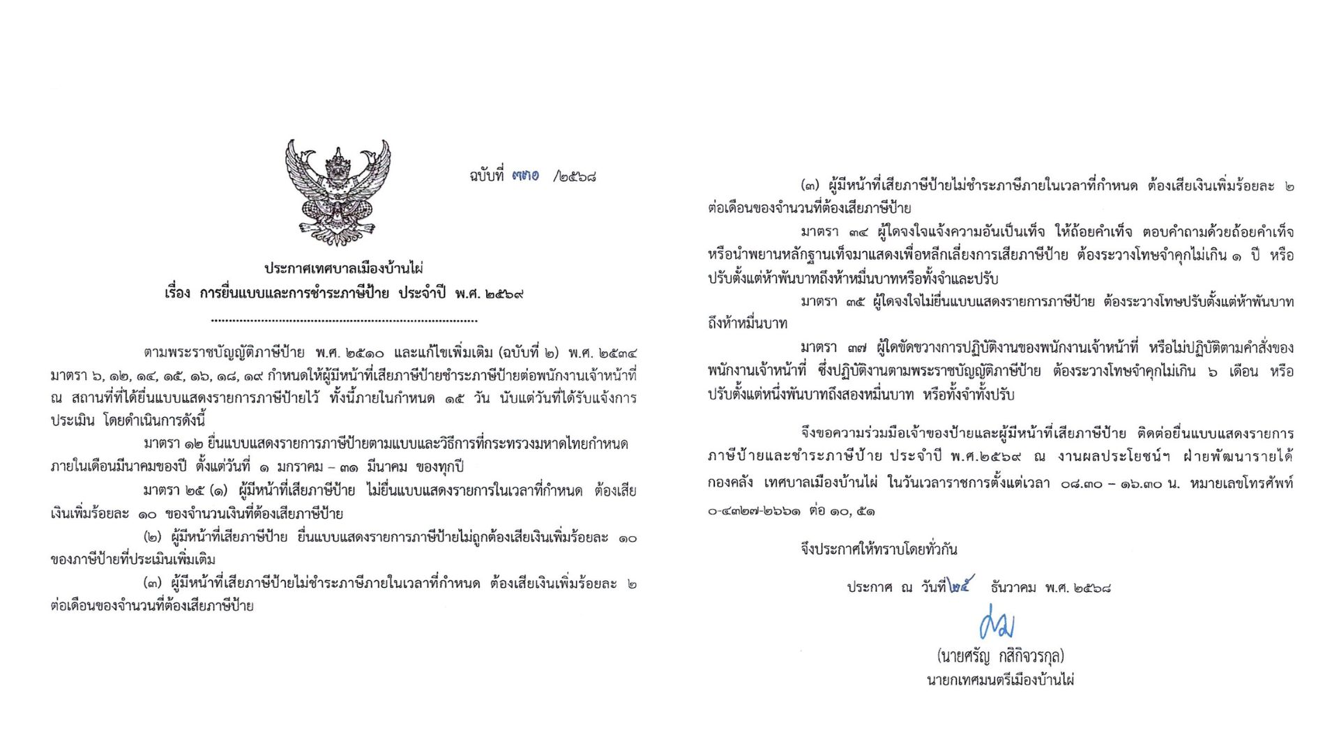 ประกาศเทศบาลเมืองบ้านไผ่ เรื่อง การยื่นแบบและการชำระภาษีป้าย ประจำปี พ.ศ. 2569