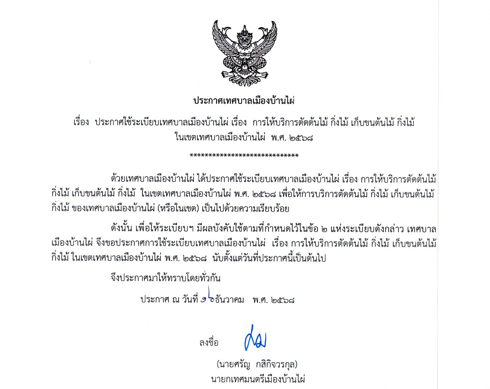 เทศบาลเมืองบ้านไผ่ข้อมูลข่าวสารประชาสัมพันธ์ประชาสัมพันธ์ประกาศ เรื่อง ประกาศใช้ระเบียบเทศบาลเมืองบ้านไผ่ เรื่อง การให้บริการตัดต้นไม้ กิ่งไม้ เก็บขนต้นไม้ กิ่งไม้ ในเขตเทศบาลเมืองบ้านไผ่ พ.ศ.2568
