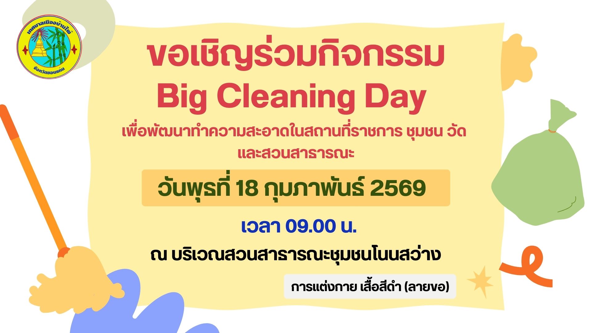 ขอเชิญร่วมกิจกรรม Big Cleaning Day เพื่อพัฒนาทำความสะอาดในสถานที่ราชการ ชุมชน วัด และสวนสาธารณะ วันพุธที่ 18 กุมภาพันธ์ 2569 เวลา 09.00 น. ณ บริเวณสวนสาธารณะชุมชนโนนสว่าง ***การแต่งกาย เสื้อสีดำ (ลายขอ)***
