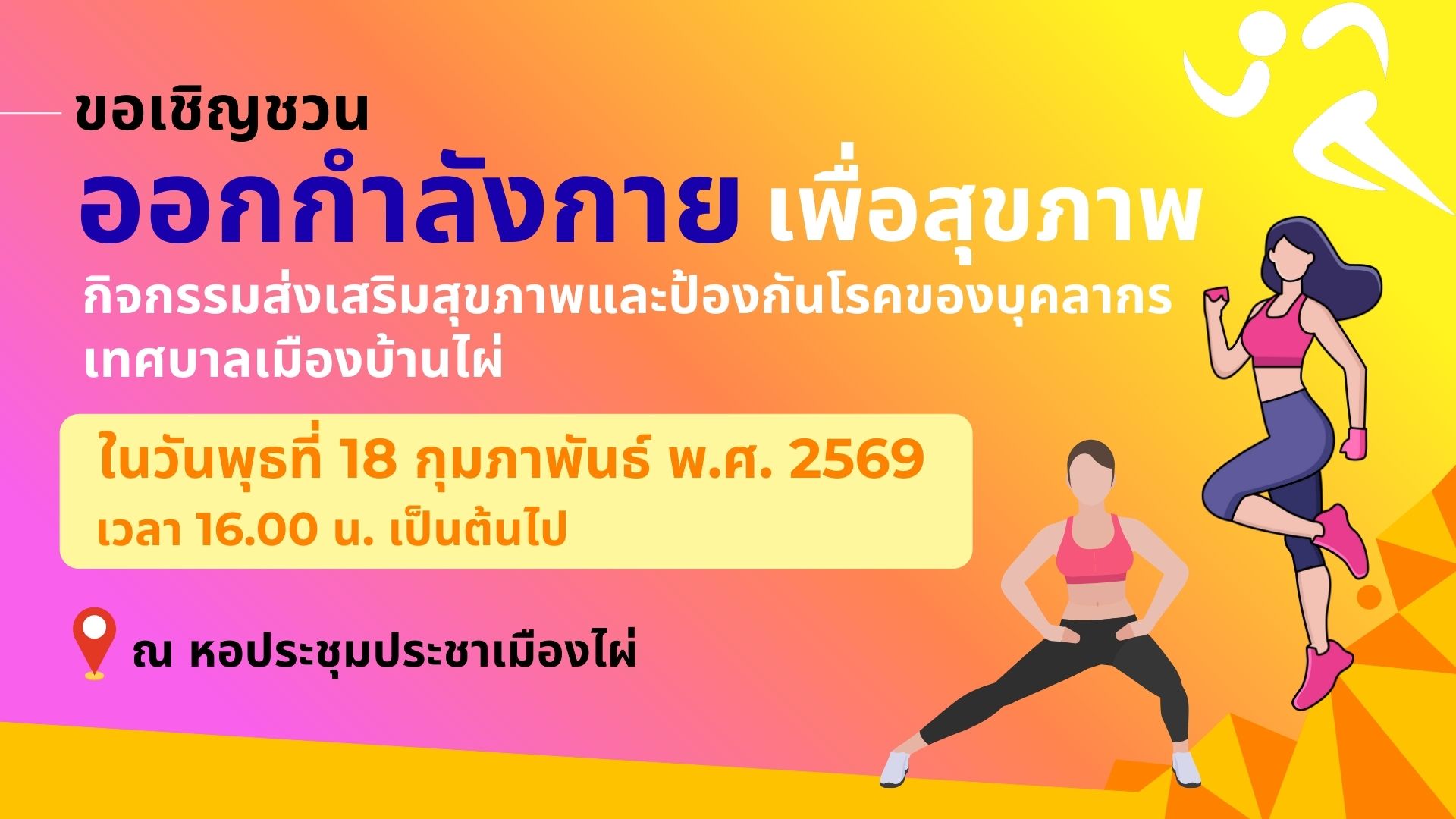 ประชาสัมพันธ์ขอเชิญร่วมออกกำลังกายเพื่อสุขภาพ กิจกรรมส่งเสริมสุขภาพและป้องกันโรคของบุคลากร เทศบาลเมืองบ้านไผ่ |