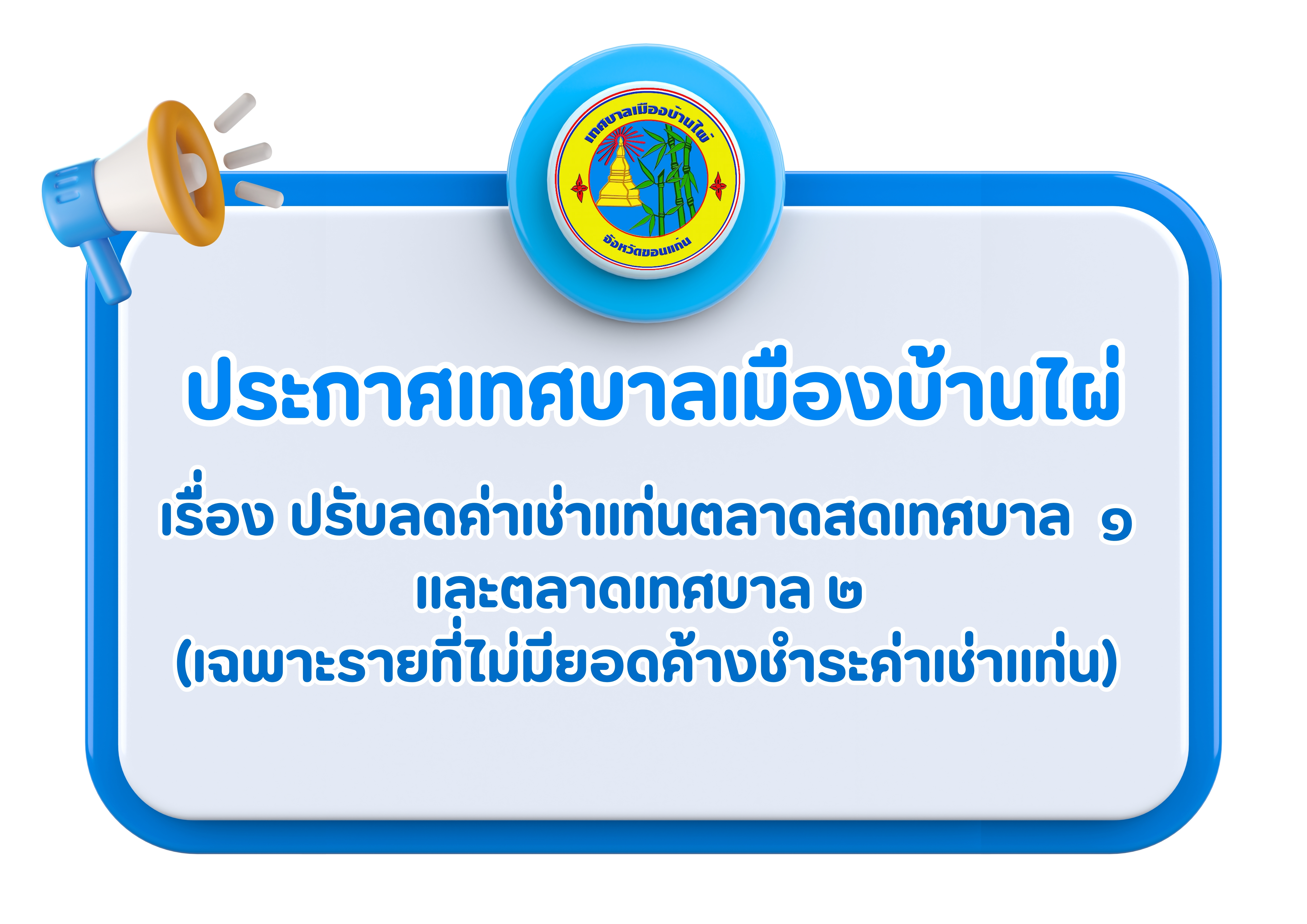 เทศบาลเมืองบ้านไผ่ข้อมูลข่าวสารประชาสัมพันธ์ประกาศเทศบาลเมืองบ้านไผ่ เรื่อง ปรับลดค่าเช่าแท่นตลาดสดเทศบาล ๑ และตลาดเทศบาล ๒ (เฉพาะรายที่ไม่มียอดค้างชำระค่าเช่าแท่น)
